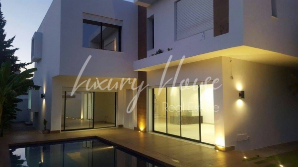 Luxury House vous propose à la location une luxueuse villa S+4 avec piscine et jardin gazonnée et arborée , Villa moderne et élégante, conçue avec des matériaux nobles et des finitions raffinées à Gammarth
